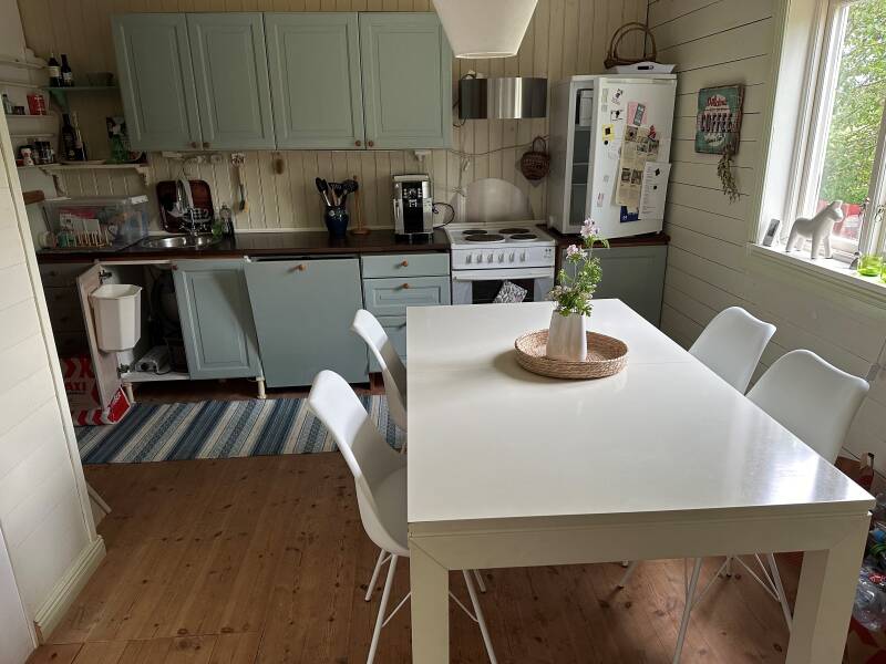 Geschirr und einige Haushaltsgeräte sind vorhanden.
